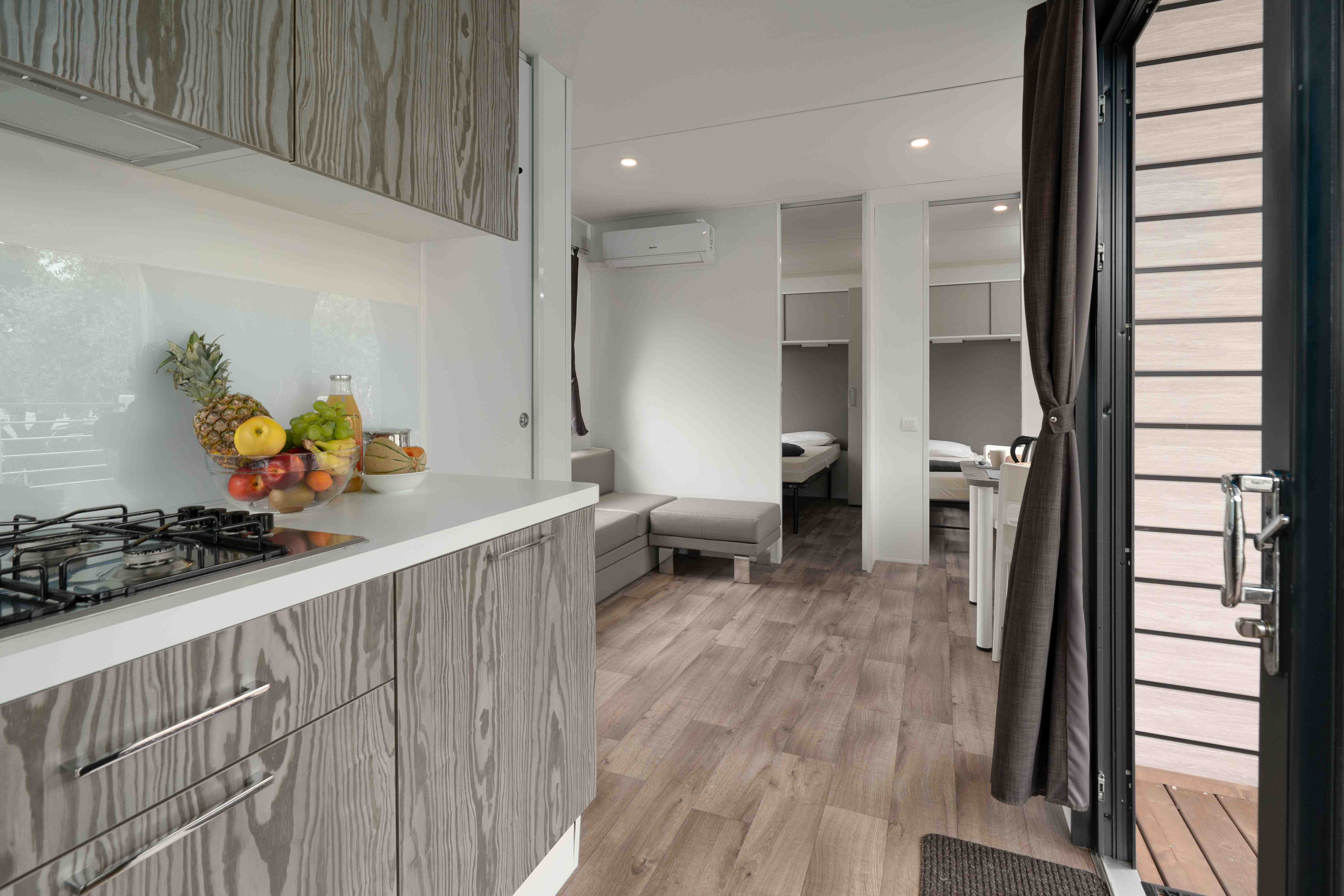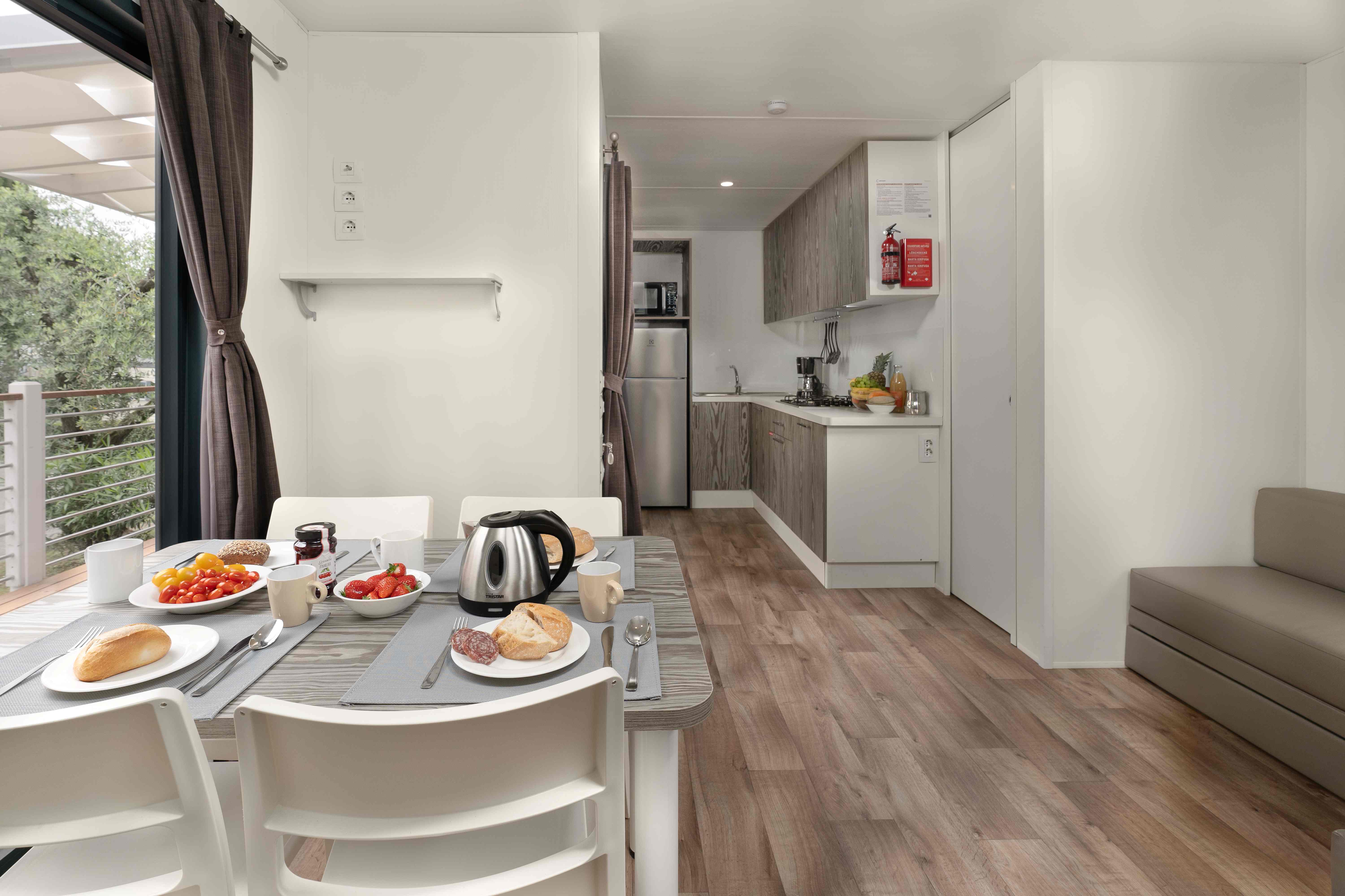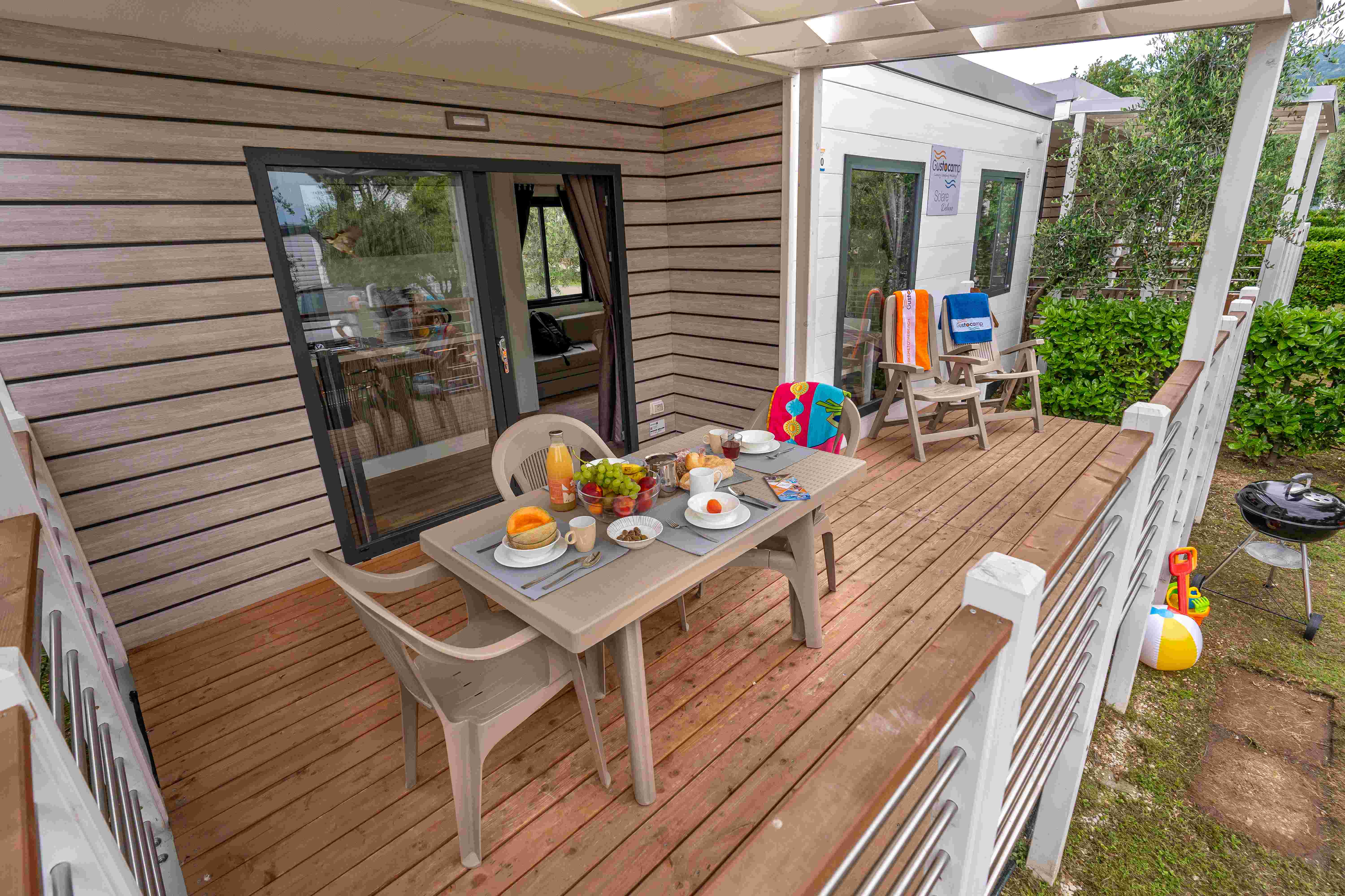 A Solare Deluxe mobilház 27 m²-es, okosan megtervezett életterével modern és világos belső teret kínál, amely ideális választás kisebb családok számára. A házban két hálószoba található – egy franciaágyas és egy két külön ággyal rendelkező szoba –, így összesen maximum 5 fő részére biztosít kényelmes elhelyezést, az ötödik vendég a nappaliban lévő kanapén pihenhet. A konyha minden igényt kielégít a magas hűtőszekrénnyel, fagyasztóval, 4 égős gázfőzőlappal, kávéfőzővel, vízforralóval és mikrohullámú sütővel. A tágas, részben fedett fa teraszon prémium kerti bútorok és saját gázüzemű barbecue sütő várja a vendégeket. Az extra kényelemről minden ablakon szúnyogháló, valamint hűtésre és fűtésre egyaránt alkalmas légkondicionáló gondoskodik
