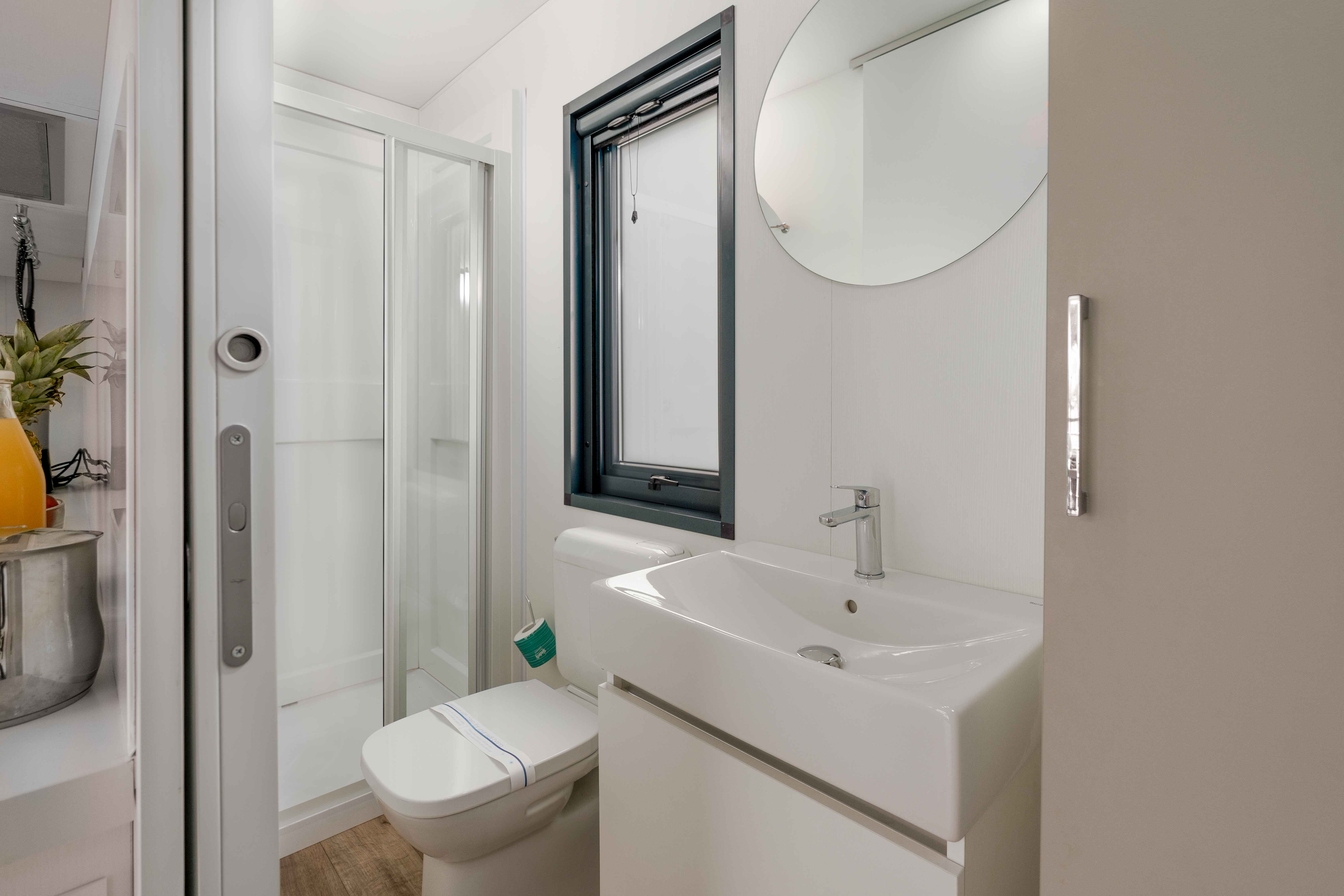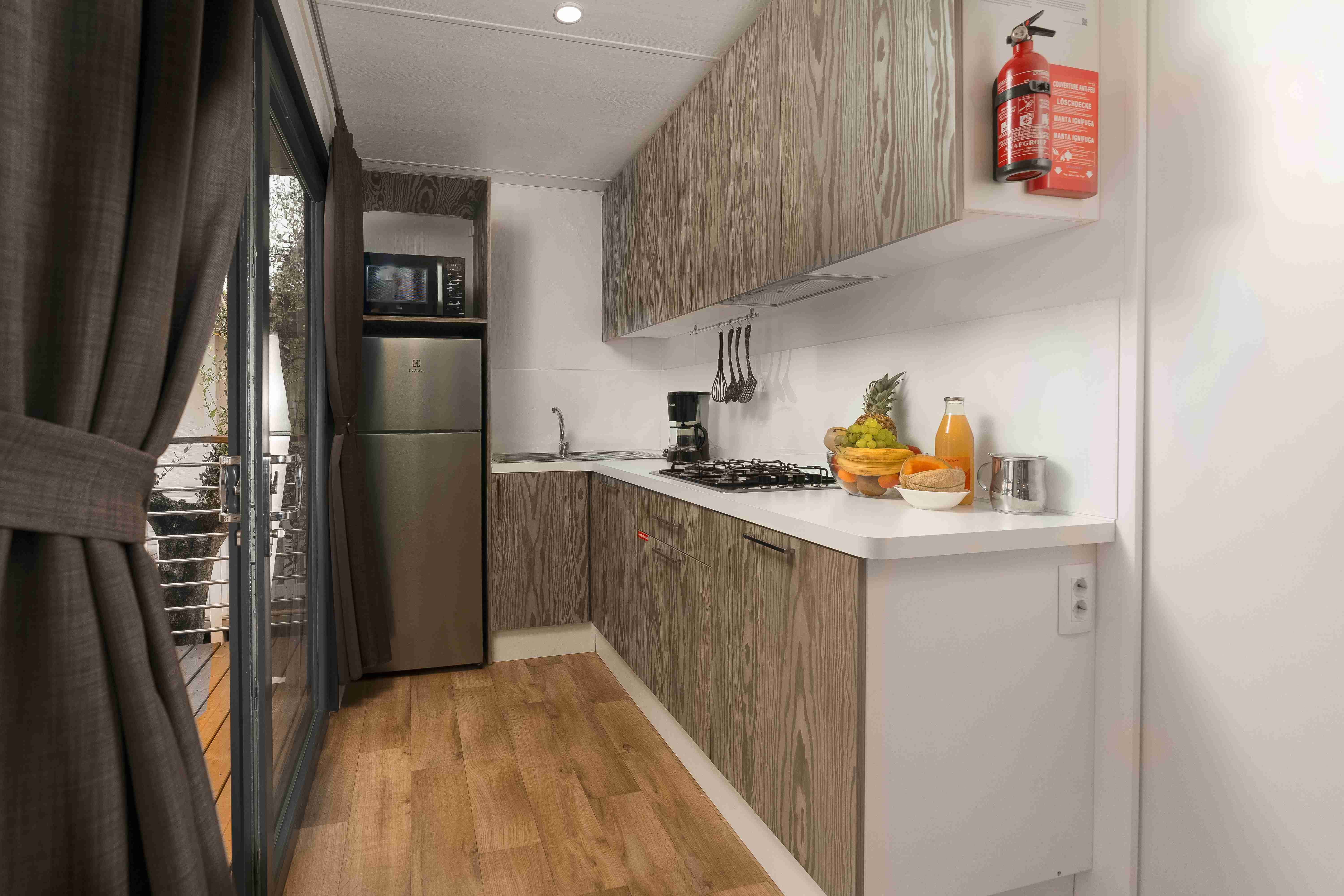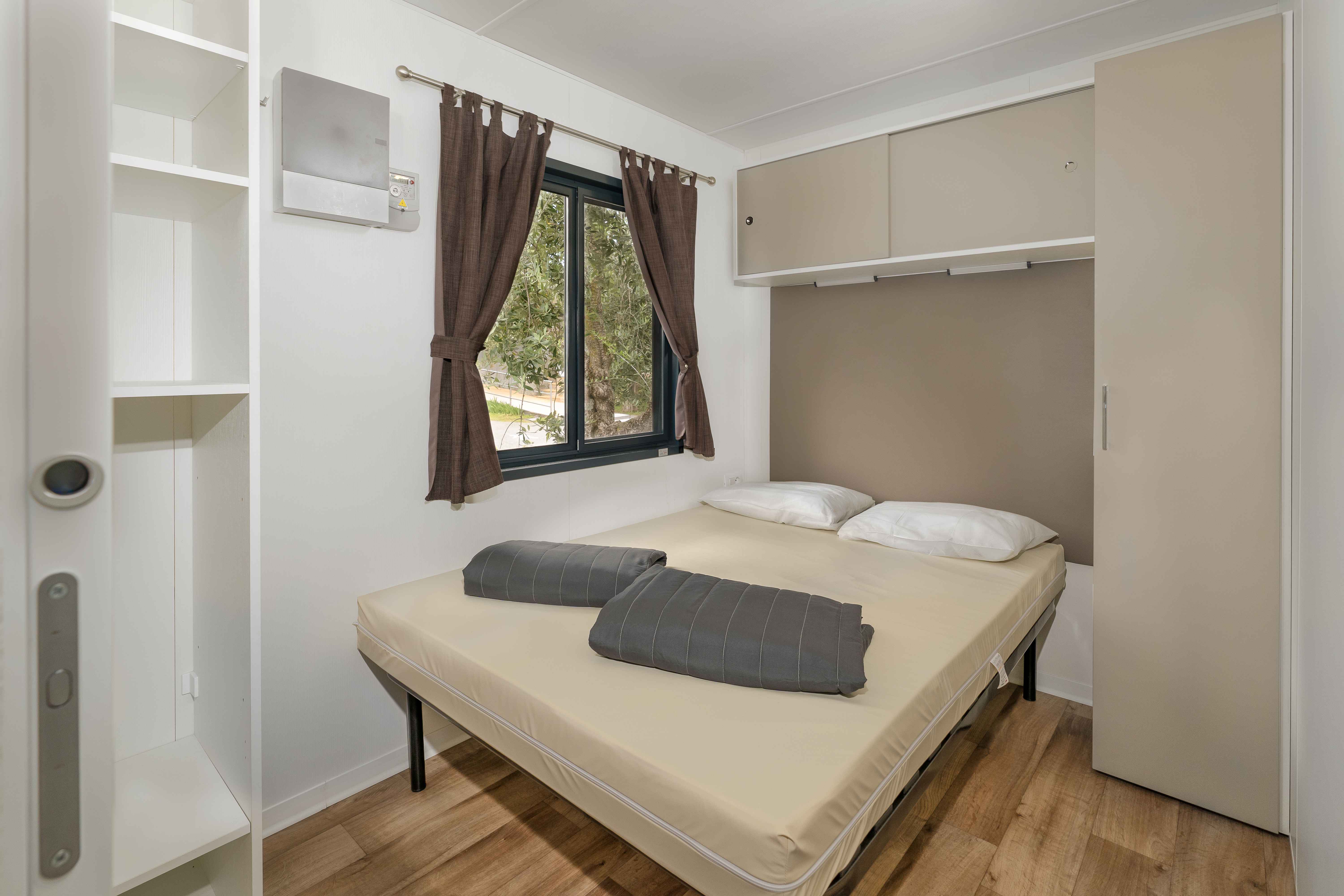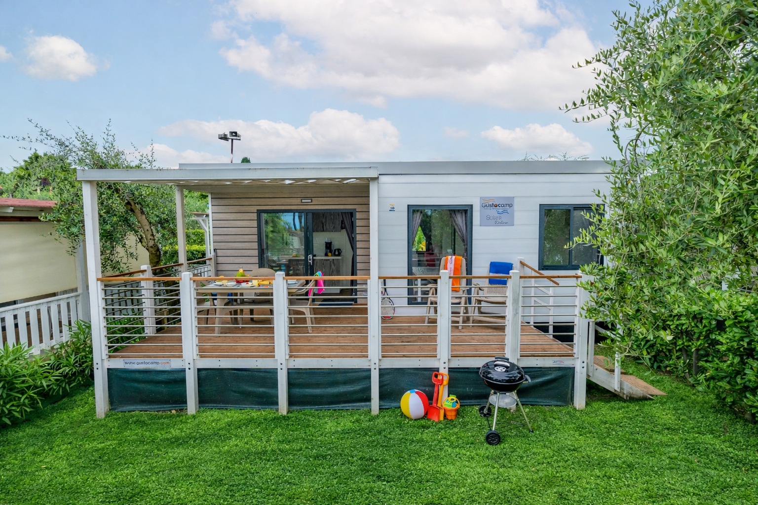 A Solare Deluxe mobilház 27 m²-es, okosan megtervezett életterével modern és világos belső teret kínál, amely ideális választás kisebb családok számára. A házban két hálószoba található – egy franciaágyas és egy két külön ággyal rendelkező szoba –, így összesen maximum 5 fő részére biztosít kényelmes elhelyezést, az ötödik vendég a nappaliban lévő kanapén pihenhet. A konyha minden igényt kielégít a magas hűtőszekrénnyel, fagyasztóval, 4 égős gázfőzőlappal, kávéfőzővel, vízforralóval és mikrohullámú sütővel. A tágas, részben fedett fa teraszon prémium kerti bútorok és saját gázüzemű barbecue sütő várja a vendégeket. Az extra kényelemről minden ablakon szúnyogháló, valamint hűtésre és fűtésre egyaránt alkalmas légkondicionáló gondoskodik
